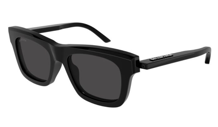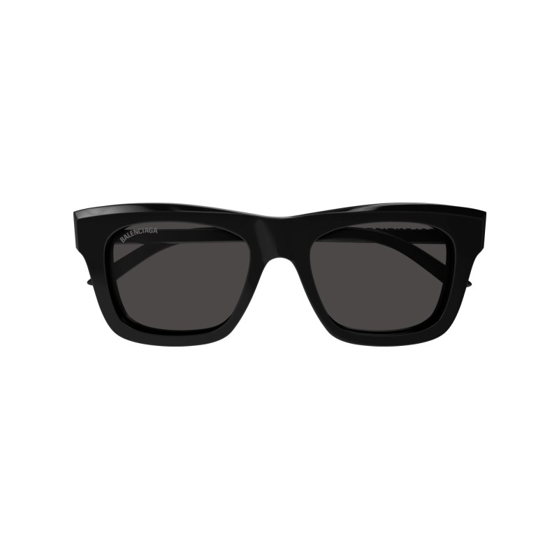 Forma de rectángulo invertido. Parte frontal de acetato negro con patillas inyectadas. Logotipo de BALENCIAGA en alto relieve en la patilla izquierda con tampografía blanca. Tornillos metálicos icónicos en la parte frontal de las patillas. Lentes grises uniformes, c,52, puente 19 y largo de varilla 150.