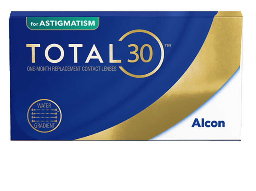 Total 30 toric es una lente de contacto de hidrogel de silicona de remplazo mensual para pacientes con astigamatismo con mayor sensibilidad ocular. Además las lentes de contacto cuentan con un ligero color azul verdoso que hace más fácil su manipulación.